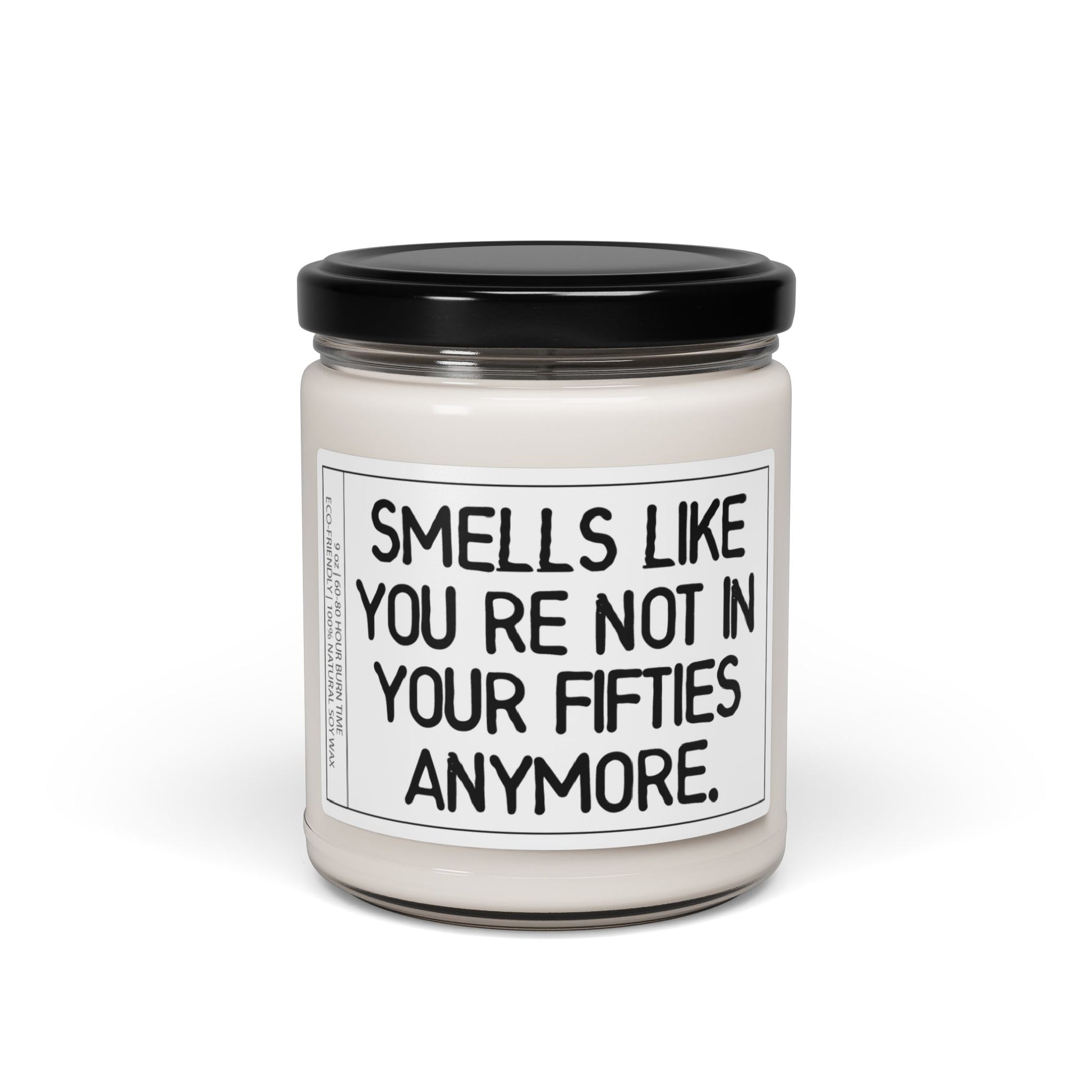 Smells Like You’re Not in Your Fifties Anymore | Birthday Celebratory Candle Gift for Saying Goodbye to Your Fifties